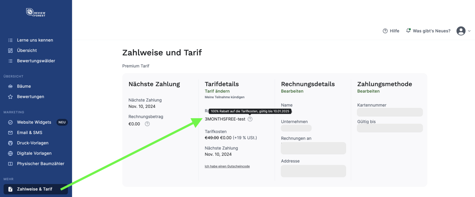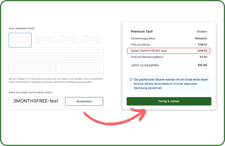 So wendest du den Gutschein bei der Aktivierung deines ReviewForest Abonnement an