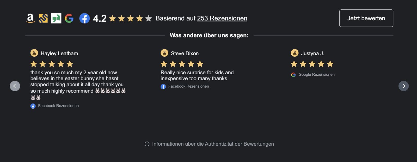 3. Ein Widget, alle Bewertungen Unser Carousel-Widget ist ein echter Gamechanger. Es zeigt Bewertungen all deiner Standorte oder Produkte in einer eleganten Übersicht. Stell dir vor: Deine Website-Besucher sehen tolles Feedback aus deinem gesamten Unternehmen – egal ob aus deinem Laden in der Innenstadt, deinem Online-Shop oder deinen Service-Standorten.