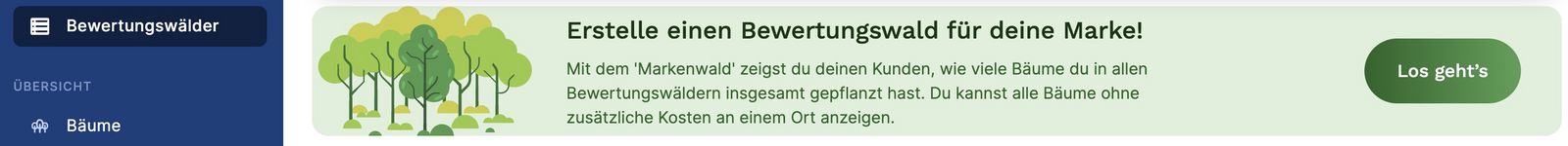 Wenn du mehr als 2 Standorte oder Produkte hast und dein Abo im Professional-Tarif läuft, erhältst du Zugang zum Markenwald über ein Banner im Bereich “Bewertungswälder”