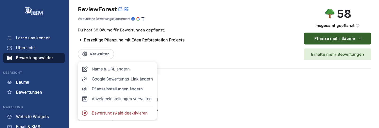 Befindet sich dein ReviewForest Konto im Standard, Premium oder Professional Tarif kannst du das Pflanzprojket für jeden deiner Bewertungswälder ändern, und das jederzeit!