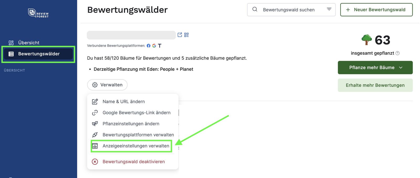 - Logge dich zunächst in deinen ReviewForest Mitgliederbereich ein und gehe zu “Bewertungswälder”: https://app.reviewforest.org/review-forests