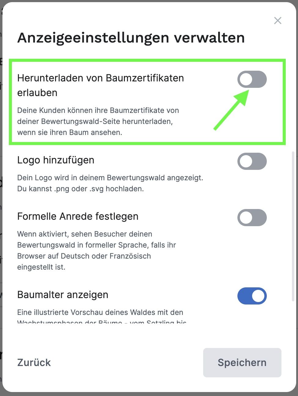 Um deinen Kunden den Download ihres Baumzertifikats zu ermöglichen, kannst du eine entsprechende Einstellung für deinen Wald treffen