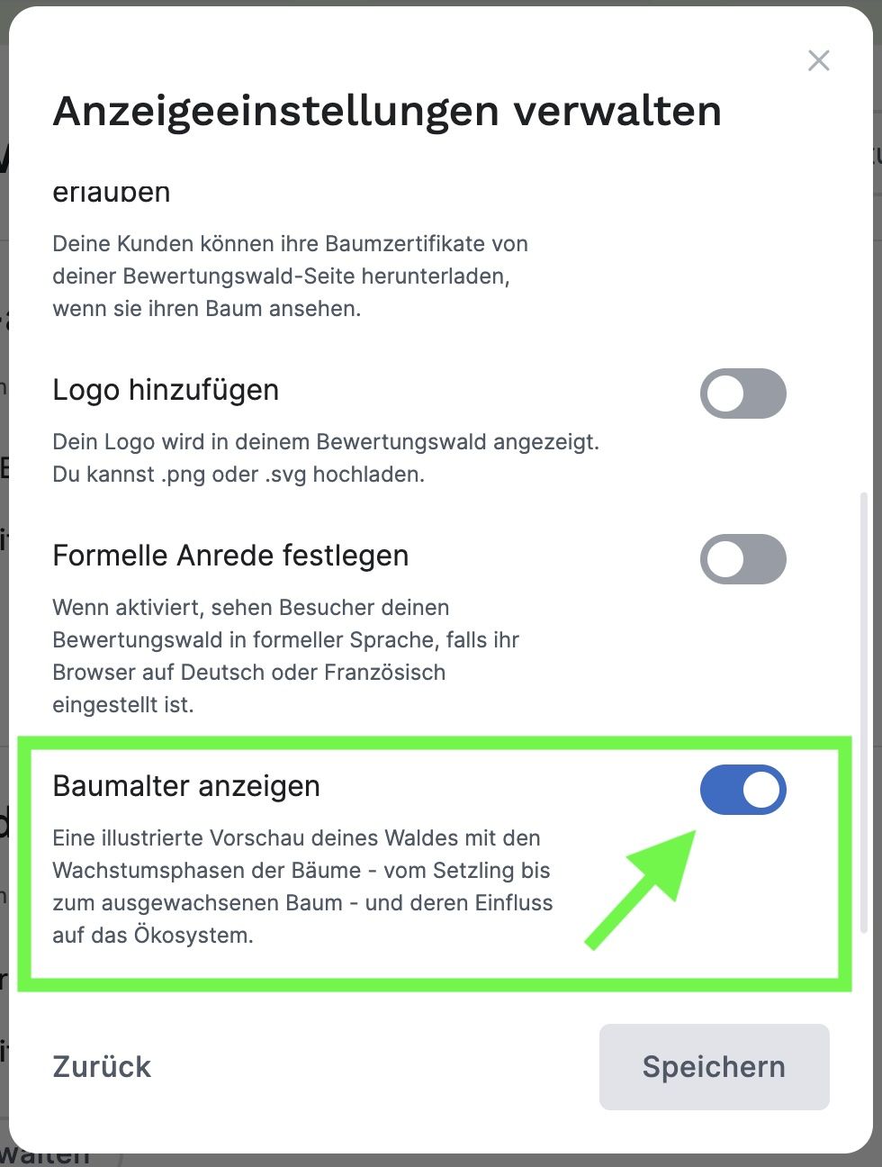 - Fahre herunter zu “Baumalter anzeigen” und löse die Auswahl mit Klick auf das Symbol. Das Symbol wird grau angezeigt und die Bäume in deinem Bewertungswald werden ausschließlich als ausgewachsene Bäume angezeigt.