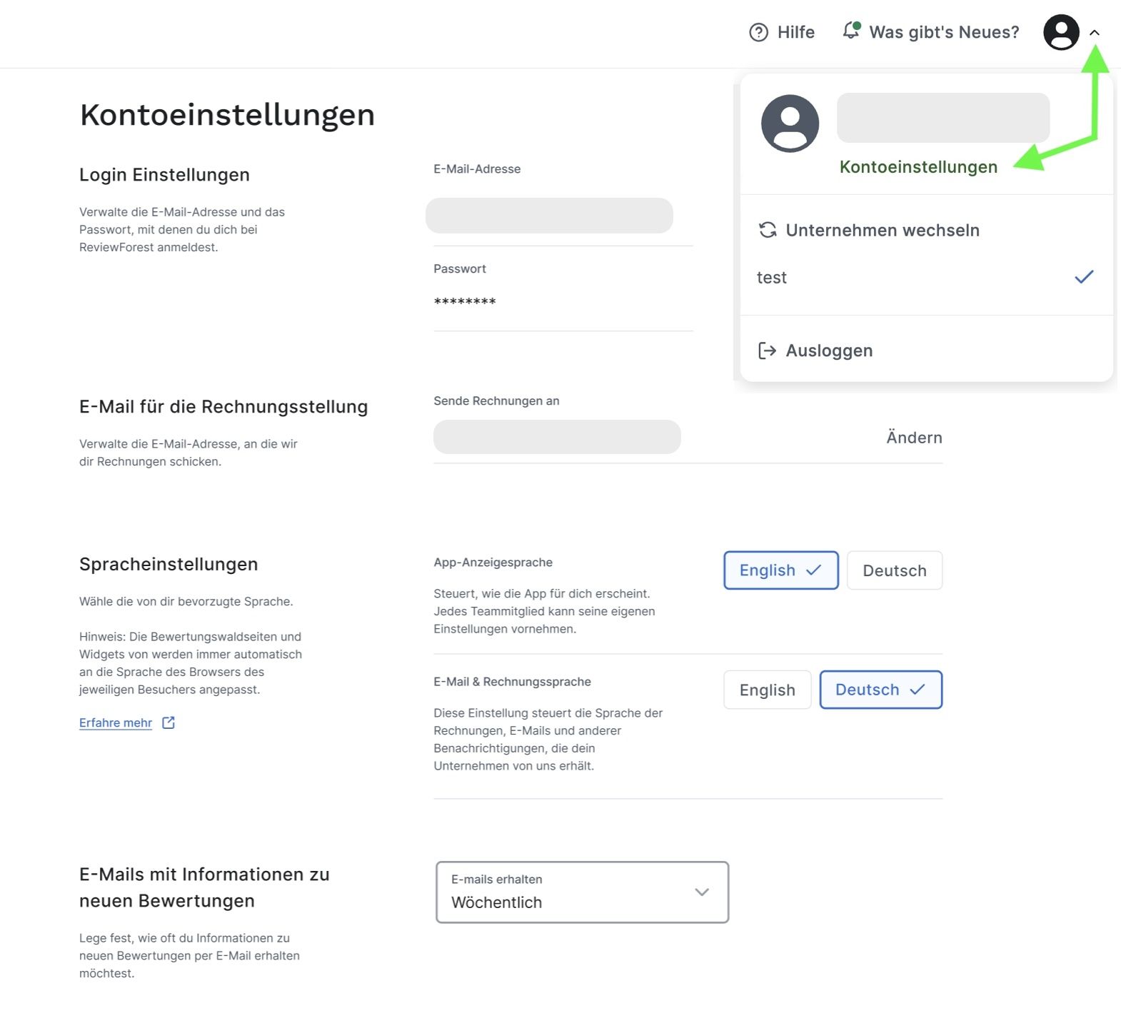 Wähle, in welcher Sprache Du Rechnungen, Passwort-Reset-E-Mails, Teammitglieder-Einladungen und Benachrichtigungen über neue Bewertungen erhalten möchtest.
