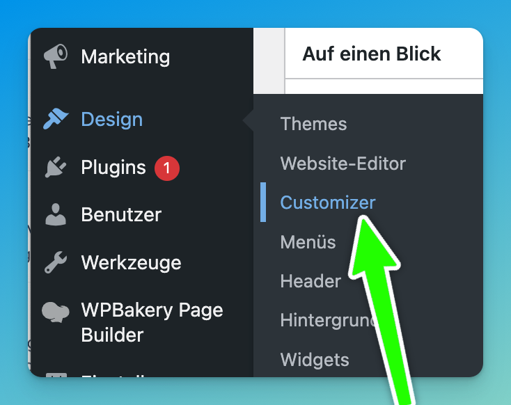 - Gehe in dem linken Menü bei deiner Wordpress Seite auf Design und auf Customizer