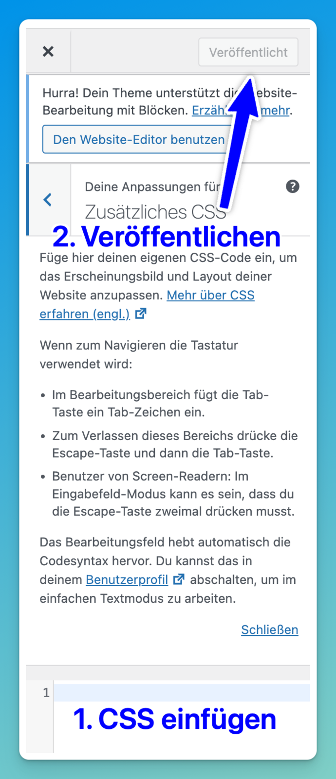 3. Dort kannst du nun individuelles CSS einfügen und durch klicken auf Veröffentlichen abspeichern und anwenden.