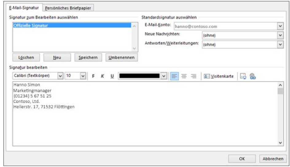 Wähle im Dropdown-Menü “E-Mail-Konto” bei “Standardsignatur auswählen” die E-Mail-Adresse aus, bei der die Signatur angezeigt werden soll.